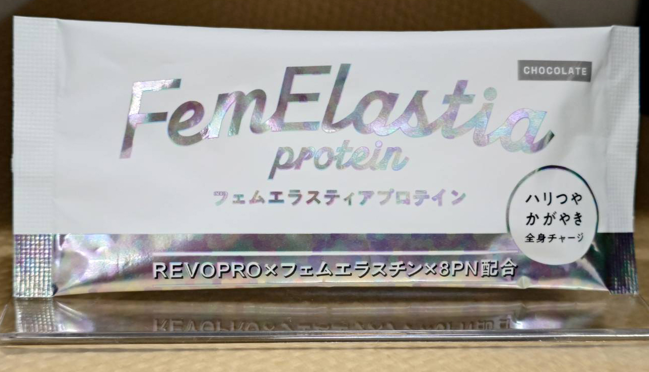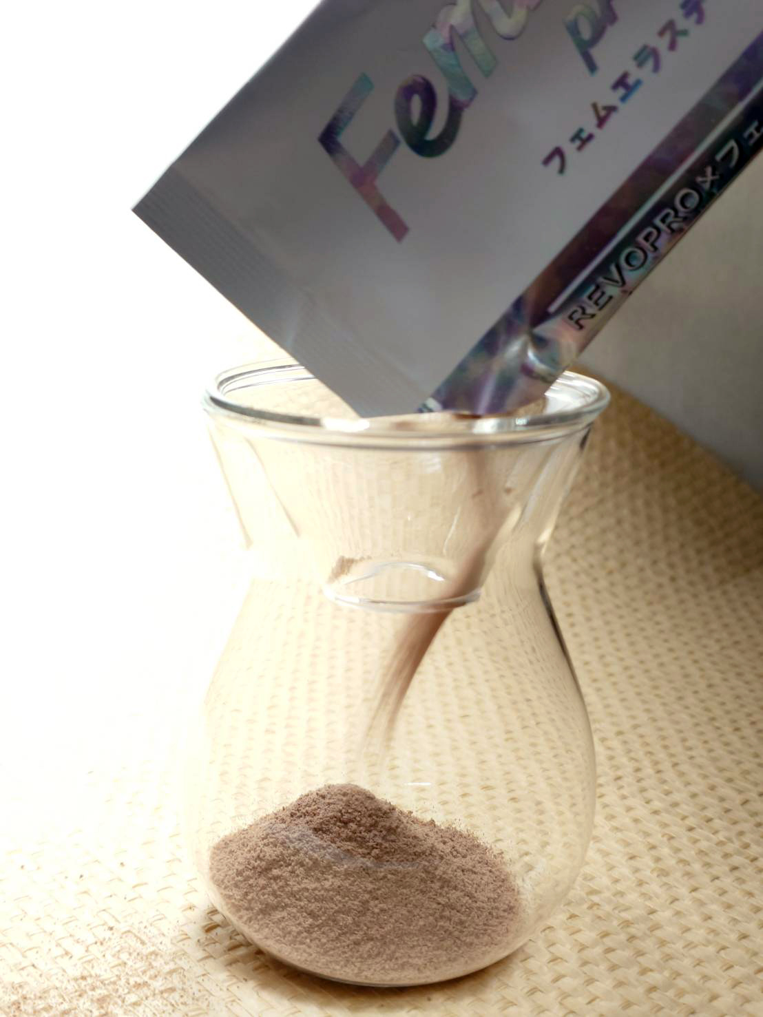原材料名:卵白粉末(アルゼンチン製造)、ココアパウダー、食物繊維、水溶性エラスチン(豚由来)、ホップ抽出発酵物/香料、甘味料(ステビア)、乳化剤、(一部に卵・大豆を含む)